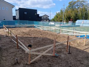 建築敷地の外周を杭とぬき板で囲い、敷地境界からの距離を正確にとり、図面通りの基礎を完成させるための基準を実際図っていきます。