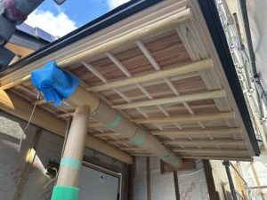 今回は大工さんのご自宅と言うこともあり、杉の磨き丸太を使用し玄関屋根を作製しました。
