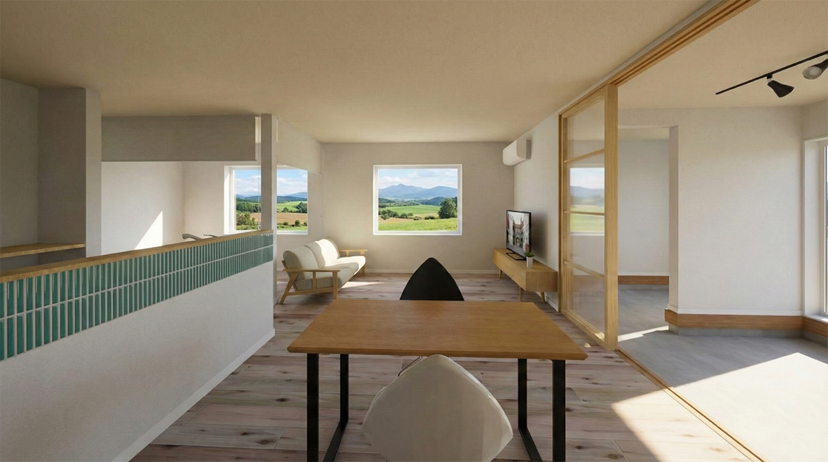 ソファに座ってくつろぐときも、ダイニングで食事をするときも、キッチンに立つときも、窓の向こうに穏やかな景色がゆったりと広がります。