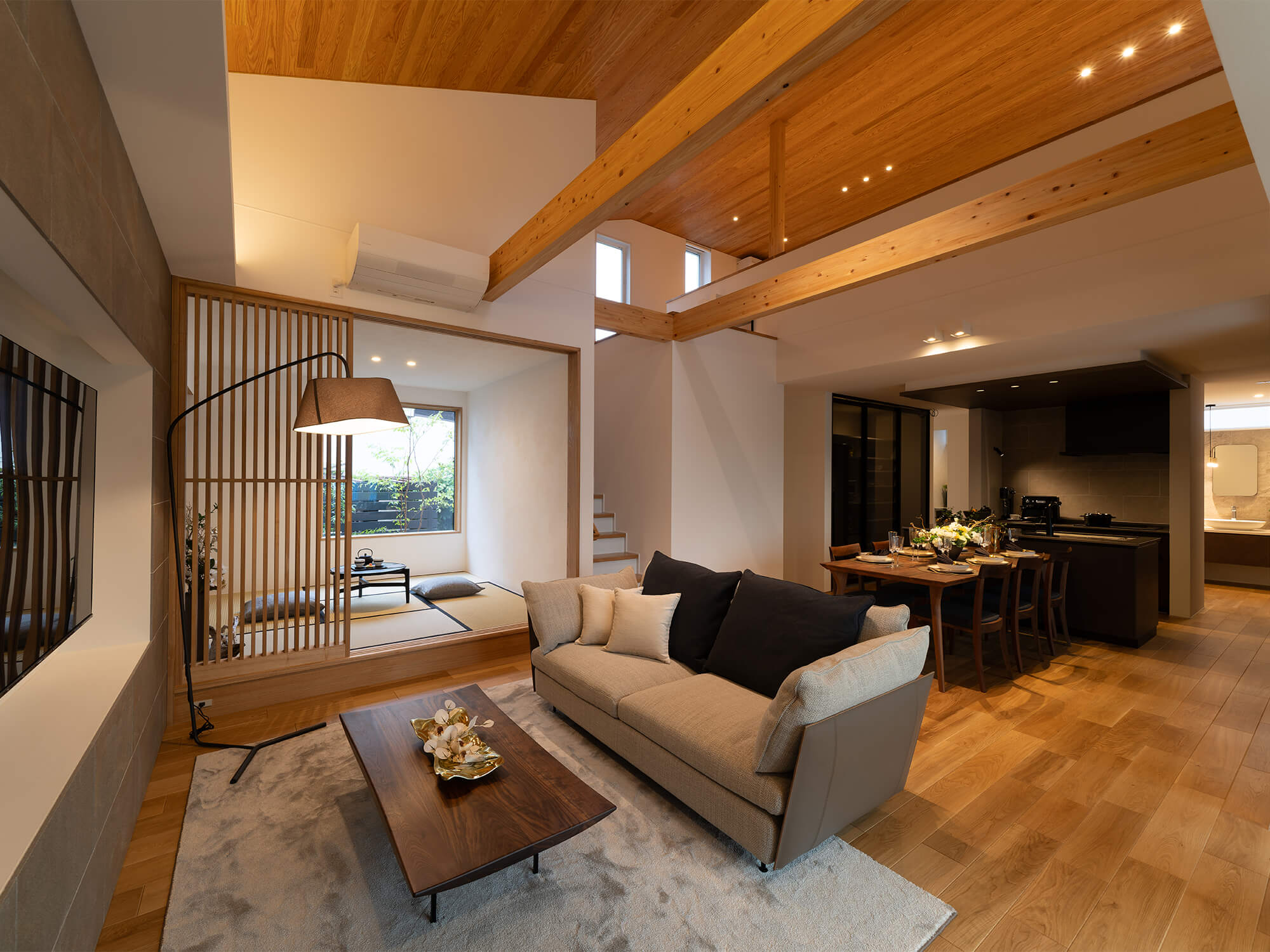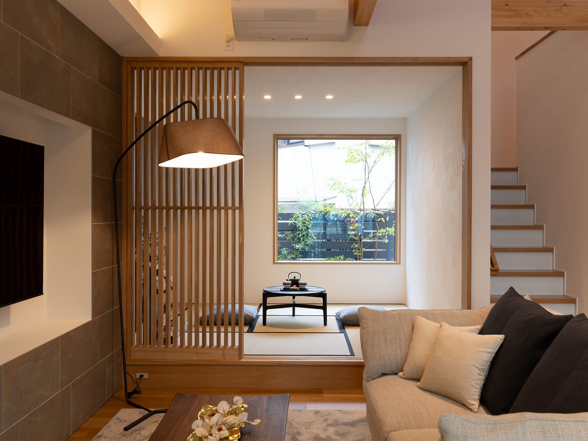 家族との絆を育みながらも、心安らぐ「こもり感」を⼤切にした和室。和の趣を添える格⼦⼾で空間を優しく区切り、心地よい光と影を演出しました。質感や色味にもこだわった畳が、暮らしに溶け込む上質な和の空間を創り出します。