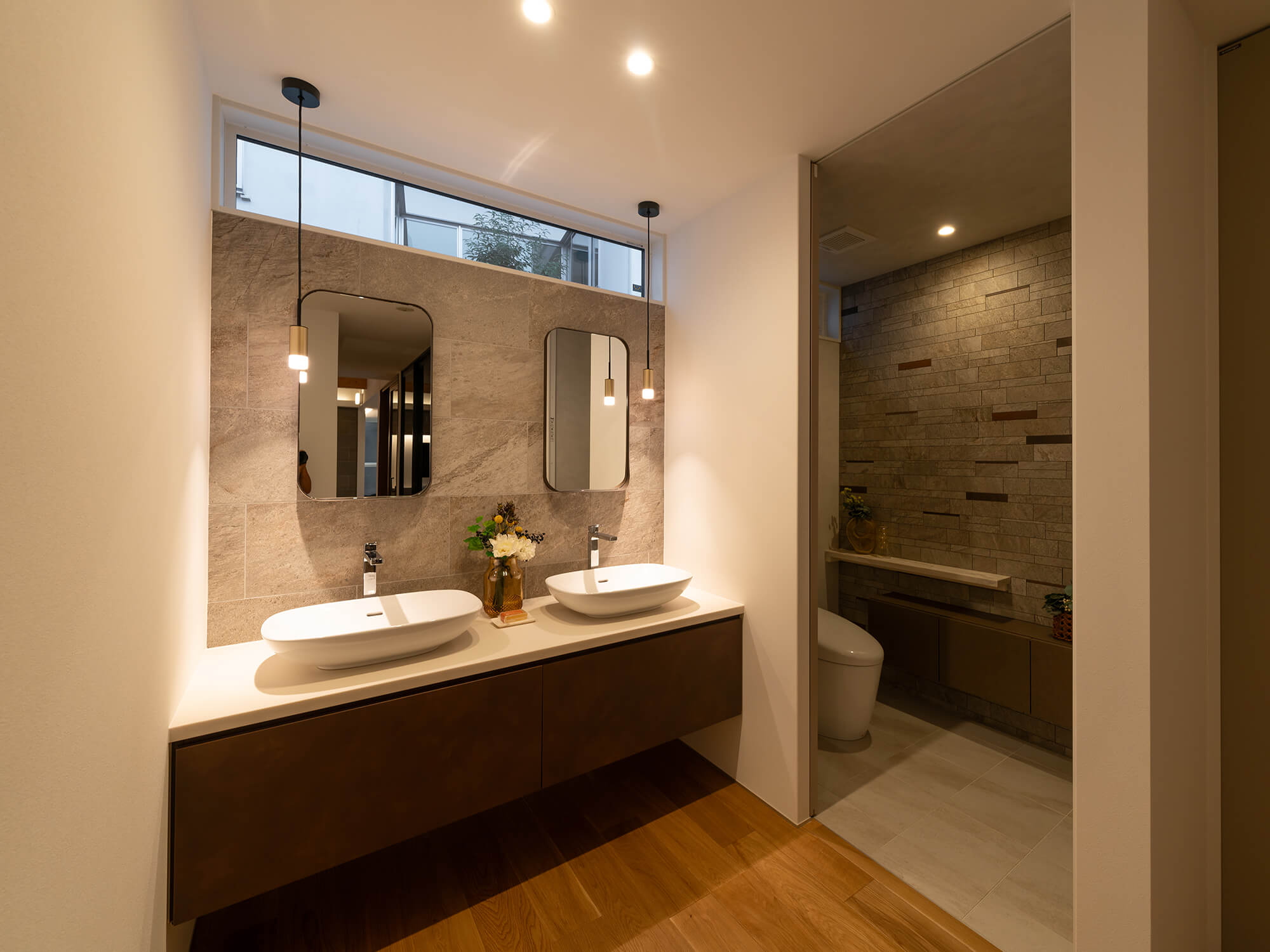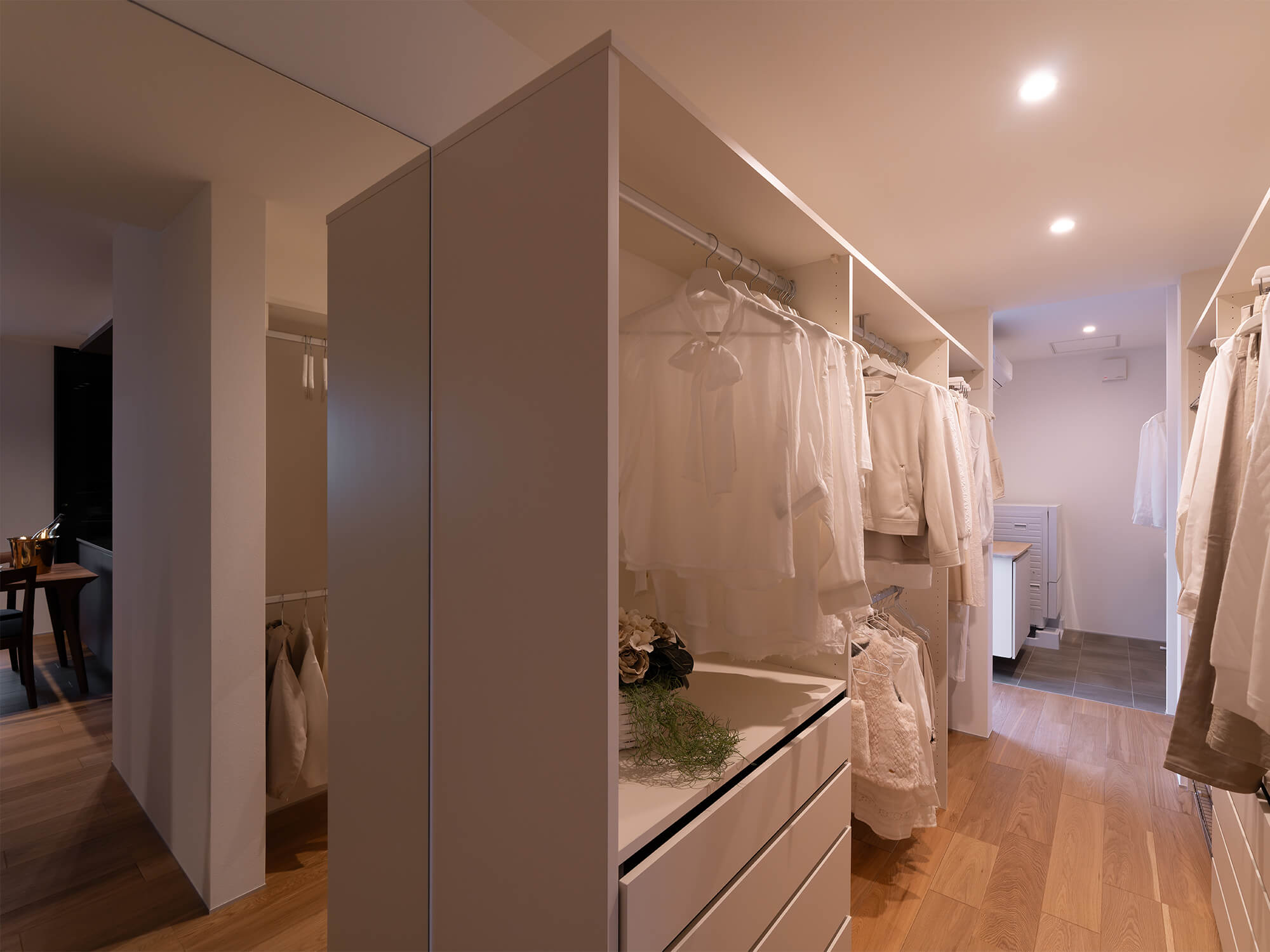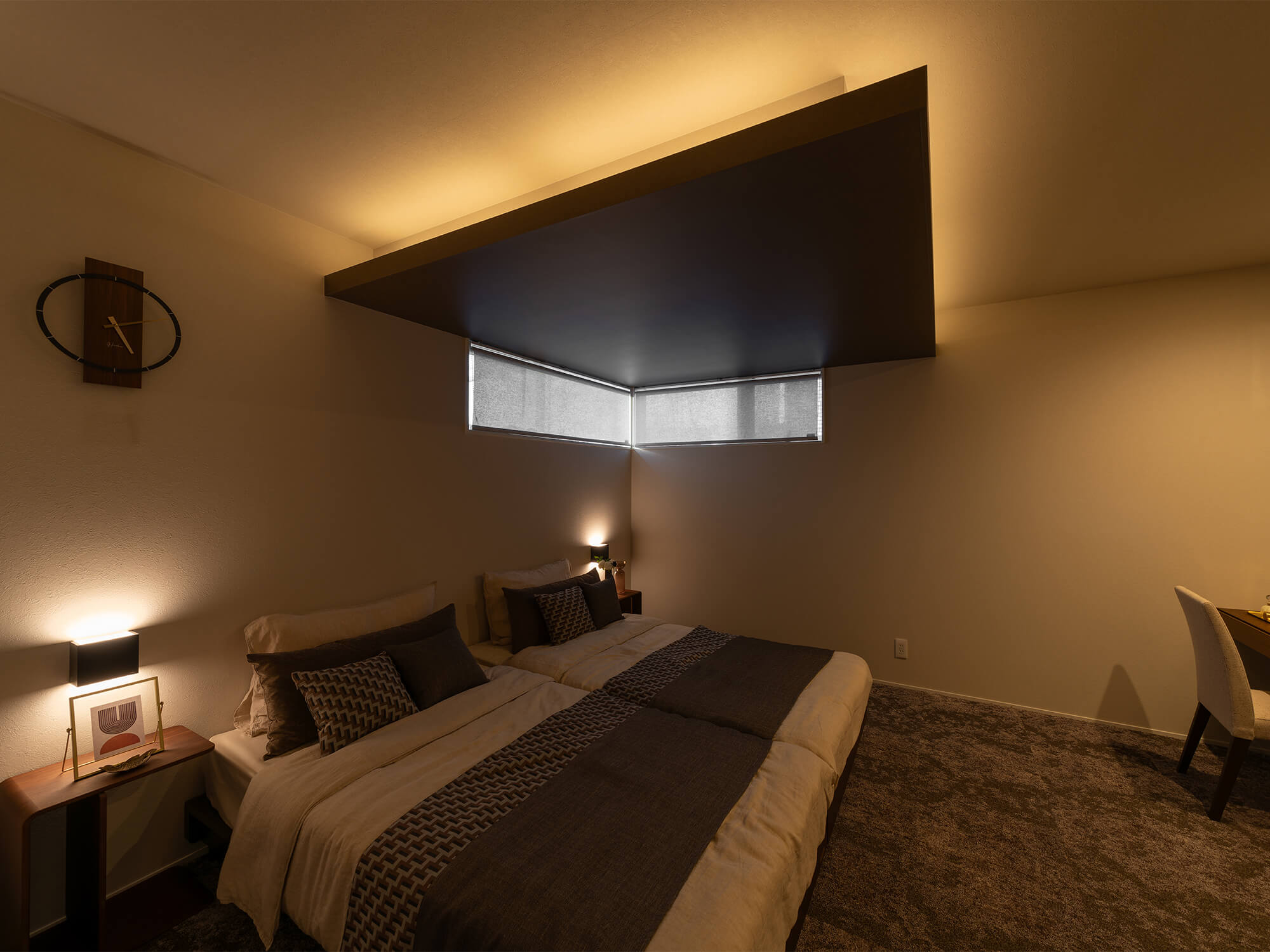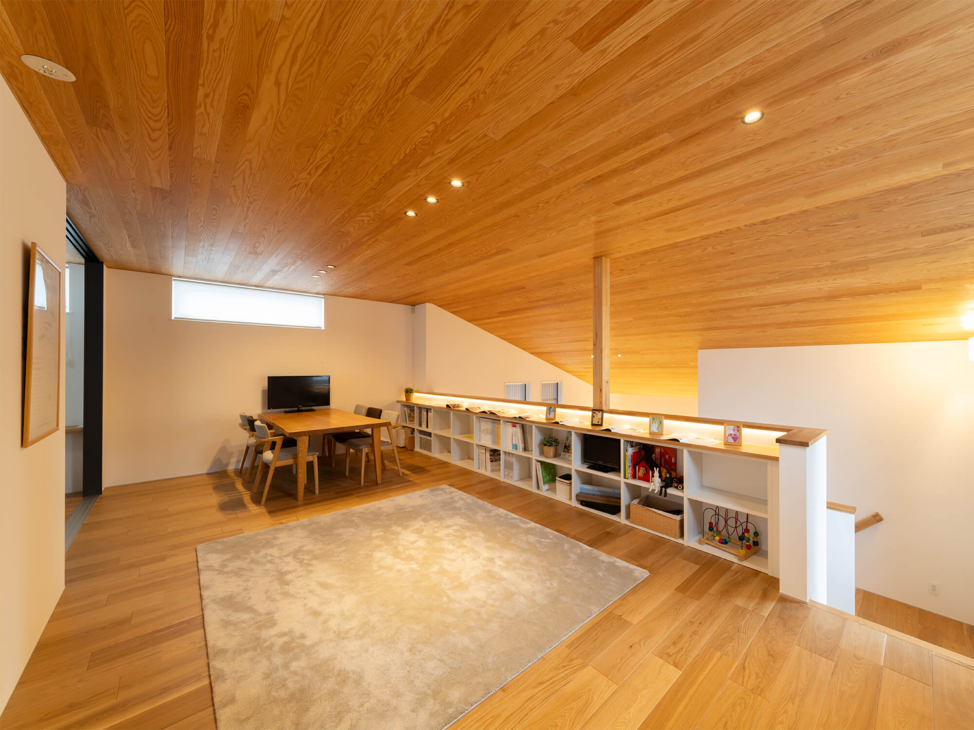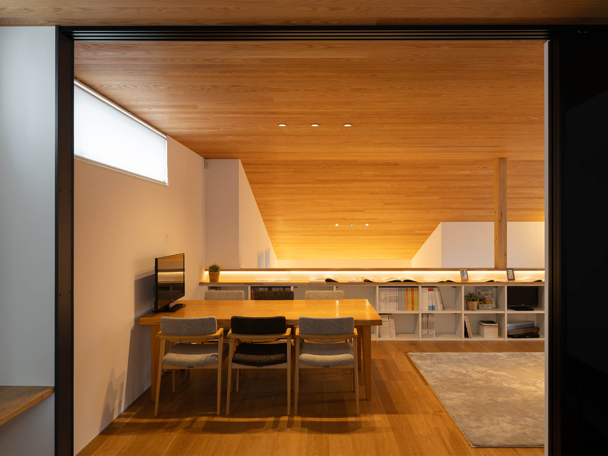 勾配天井と間接照明が演出する、開放感と落ち着きを両⽴したリビング。キッチンは⼈気の⼆型レイアウトを採⽤し、使いやすさと空間の広がりを両⽴しました。LDKのつくりには、さまざまなライフスタイルを想定した⼯夫が詰まっています。