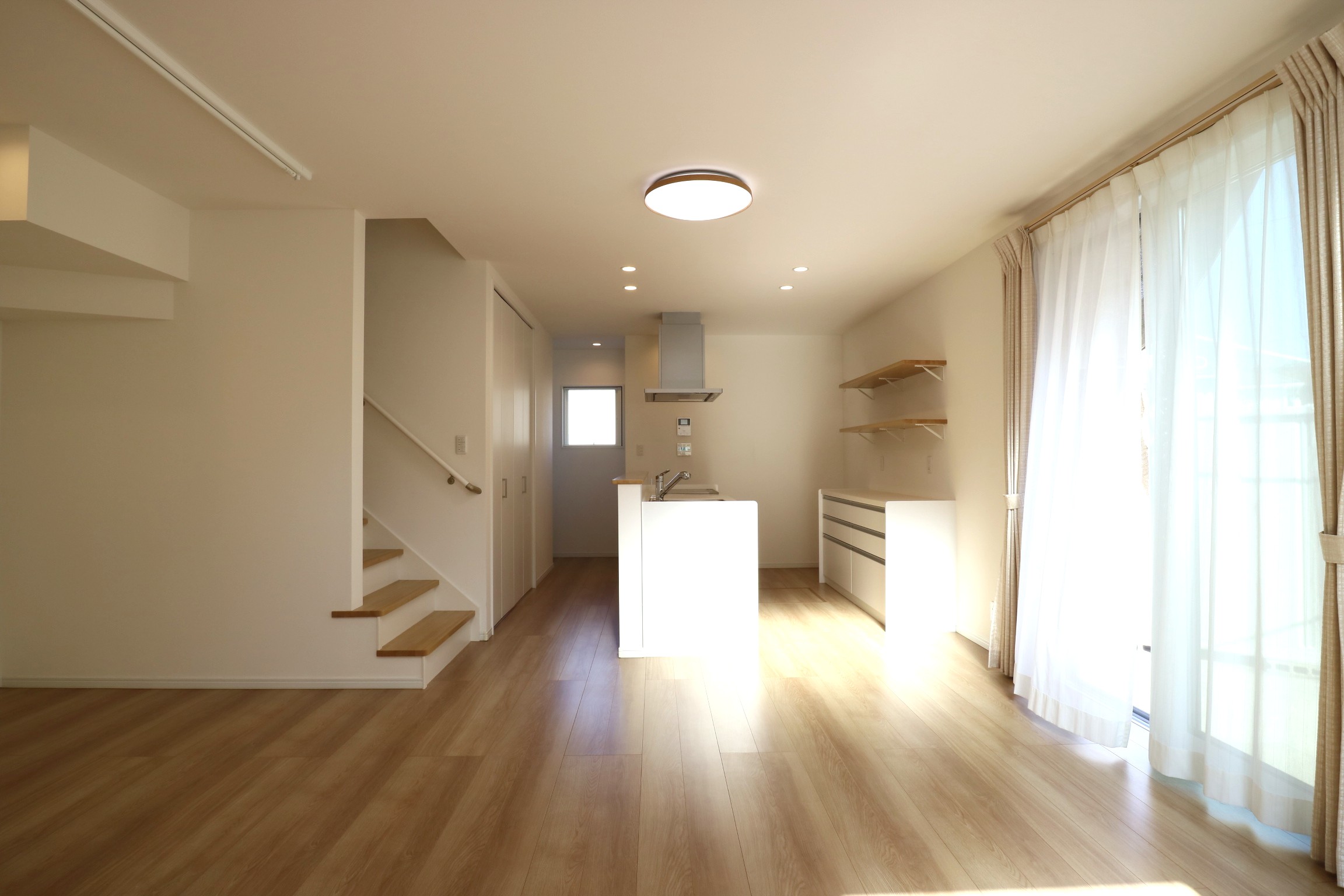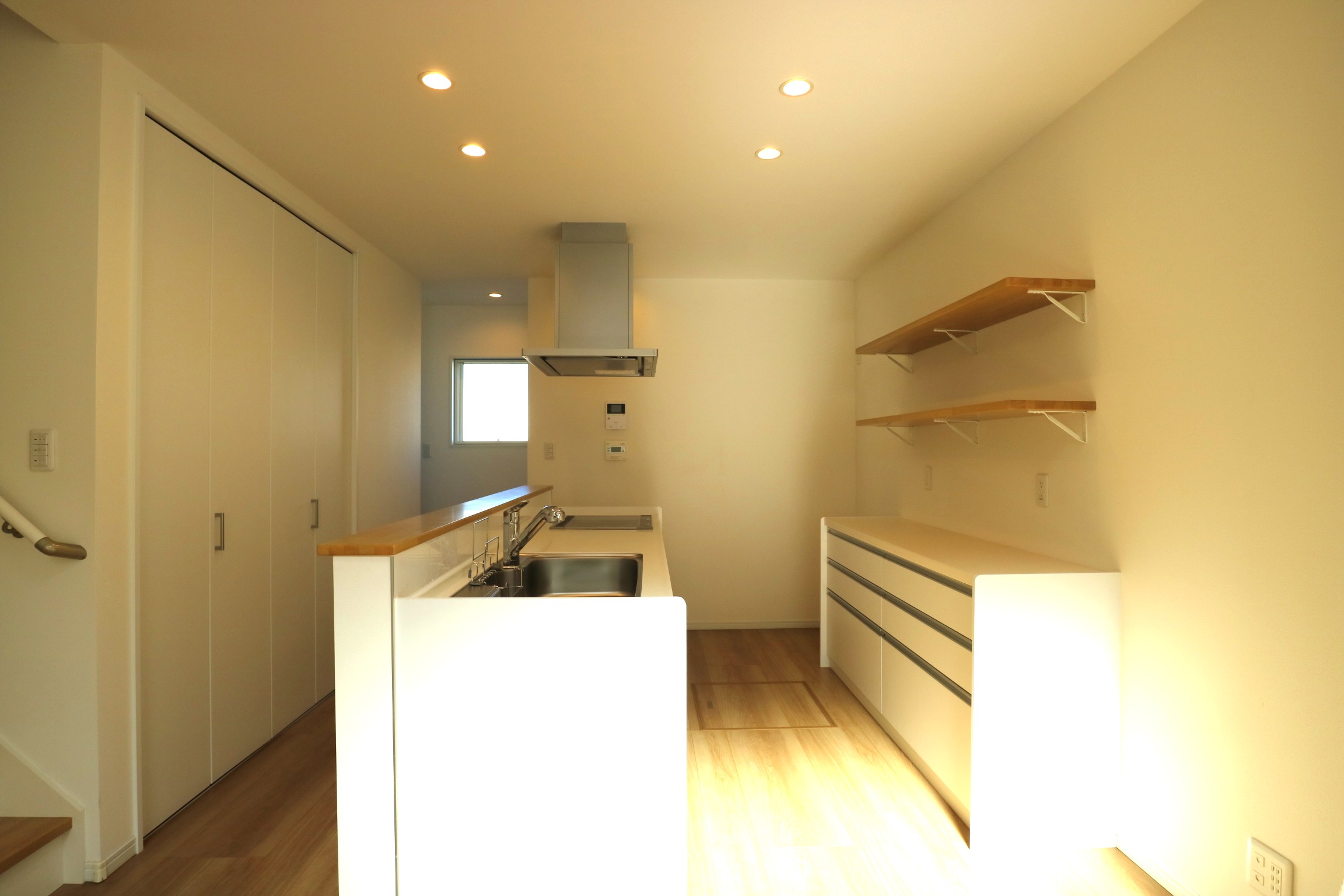 横並びのダイニングキッチンのレイアウト。 2階フリースペースは間仕切りを入れて3LDKにできます。