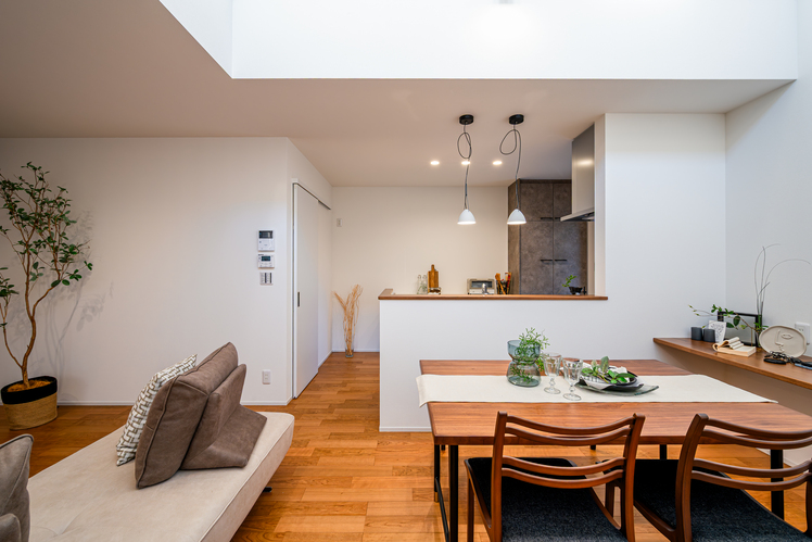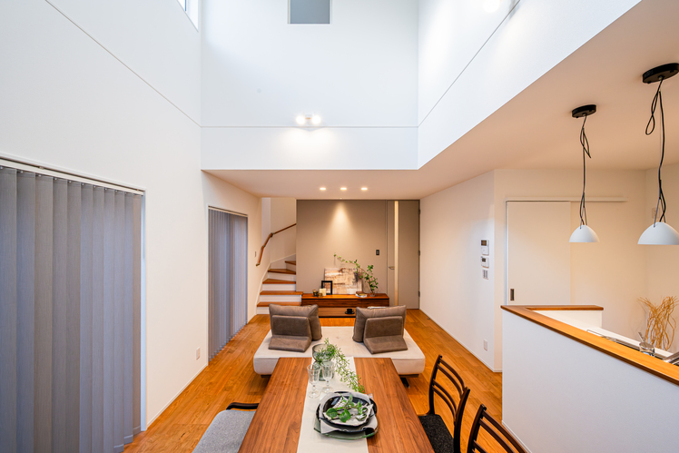 階段が空間のアクセント。白壁と無垢材フローリング、落ち着いた家具でモダンかつ居心地の良いLDK。大きな窓の陽光が家族の団欒を優しく包みます。