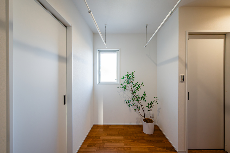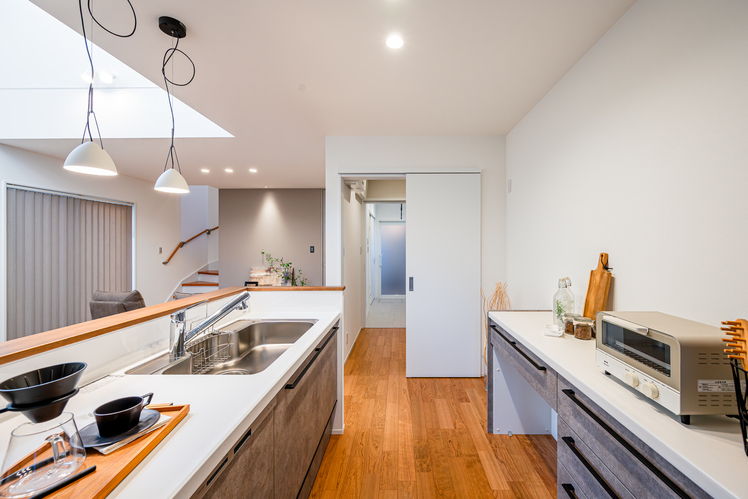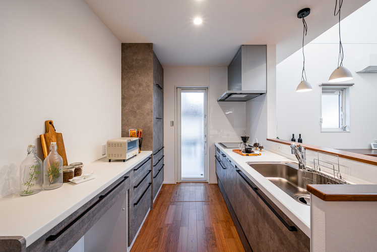 1階にある3.5帖の "ファミリークローク" から始まる家事導線が、家族との距離を近づけ心にゆとりを生む。それが "Kajitan Style"。