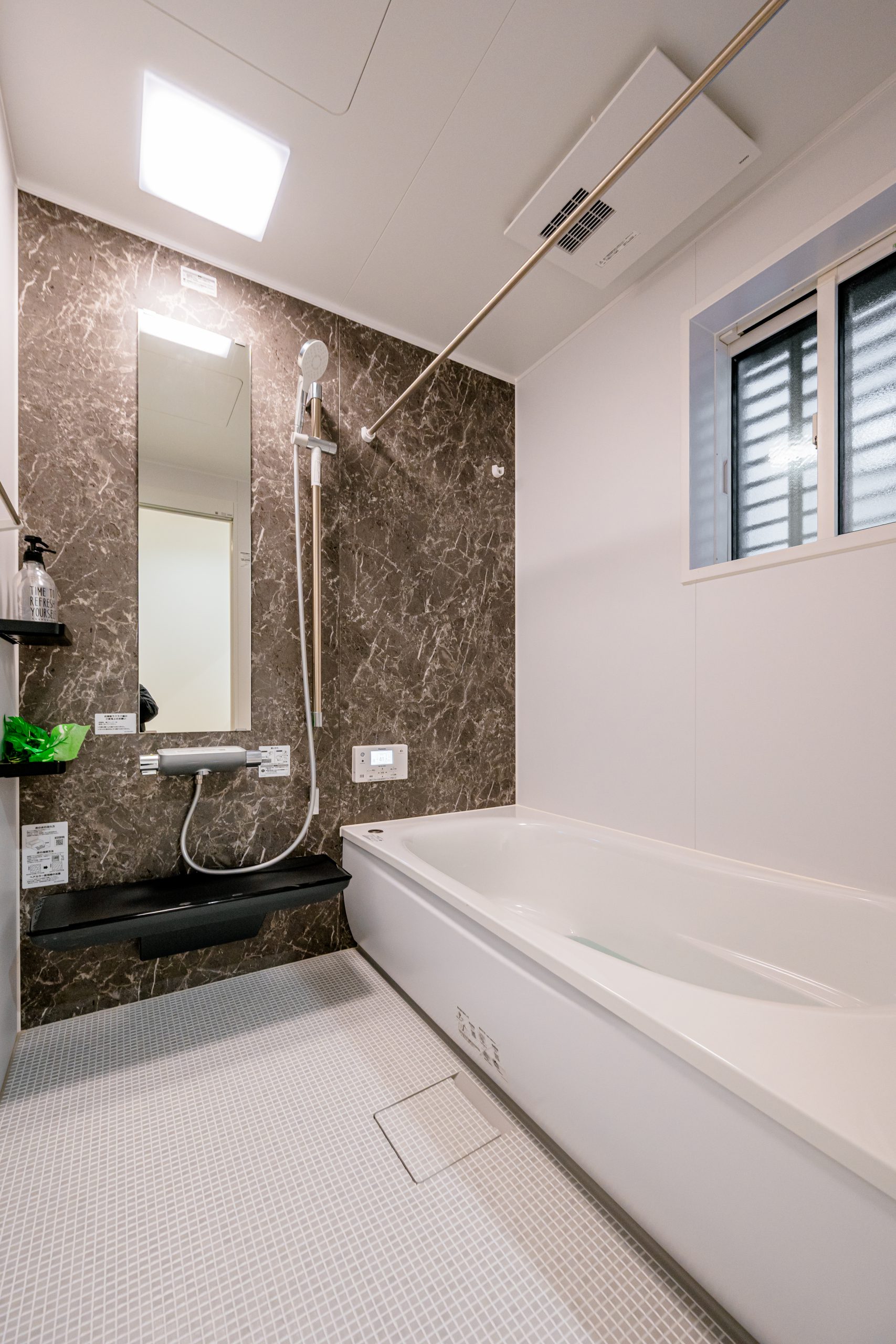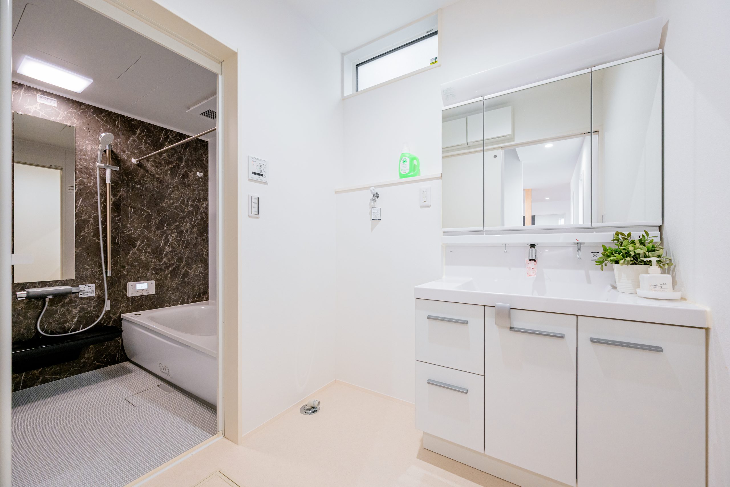 清潔感あふれるホワイトを基調とした洗面室は、お子様との歯磨きタイム、お風呂タイムもゆったり。可動式リネン棚も設置し、いつでも清潔なタオルをサッと取り出せます。