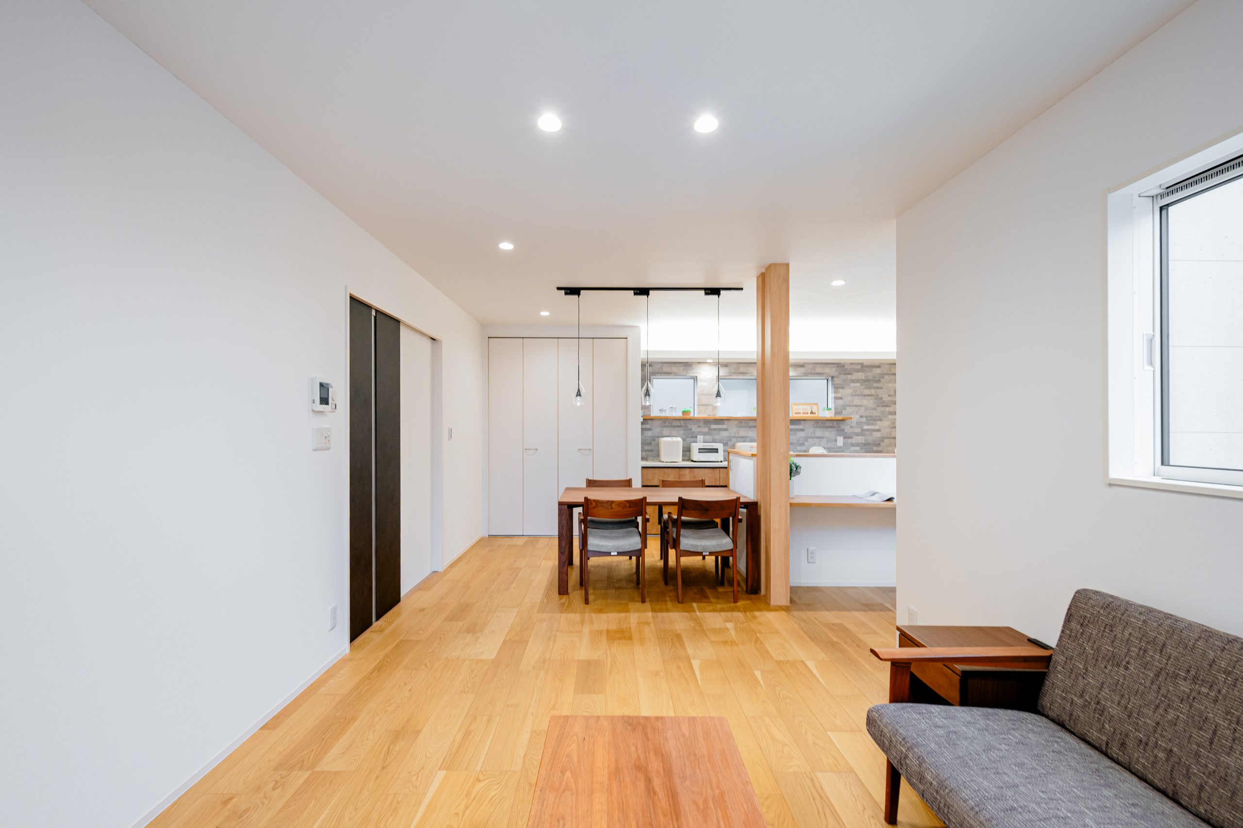 18.5畳の広々としたリビング・ダイニング。床材はオーク材を使用することで明るく、ナチュラルな温もり感のある北欧風イメージを演出します