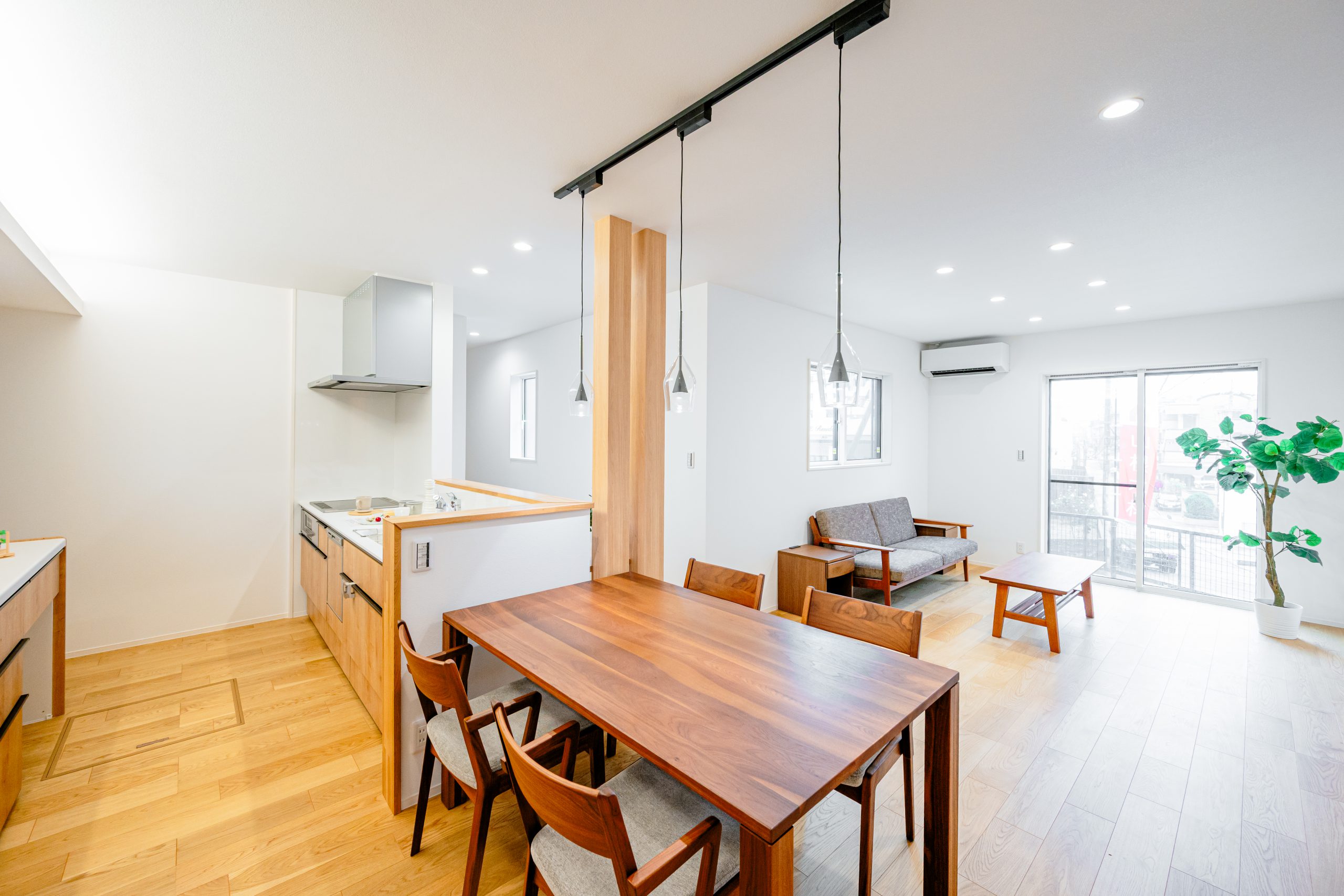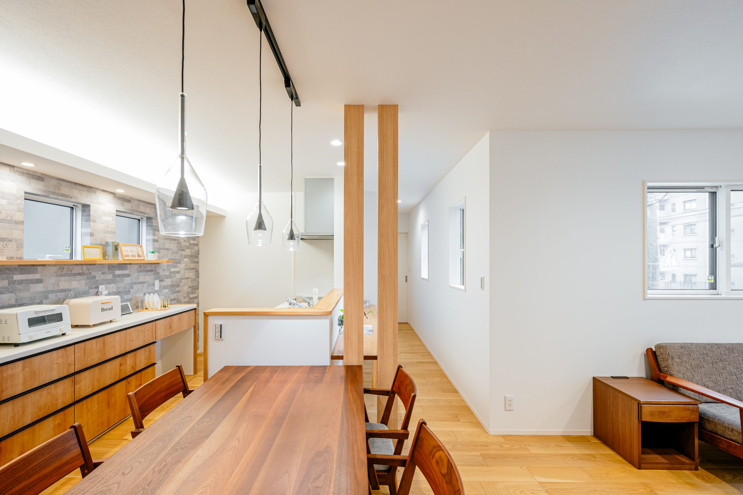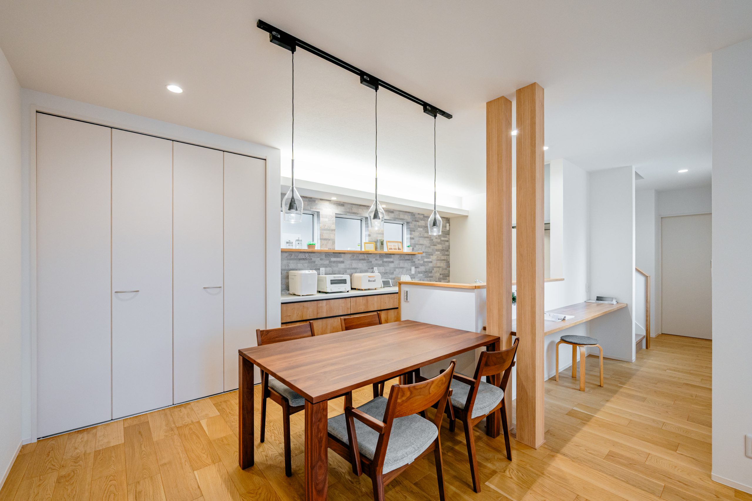 ダイニングスペースは、キッチンと直線上に配置できるように設計しています。食事を配膳する際に最短距離で行えるため、忙しいファミリー世帯の家事の負担を軽減します。
