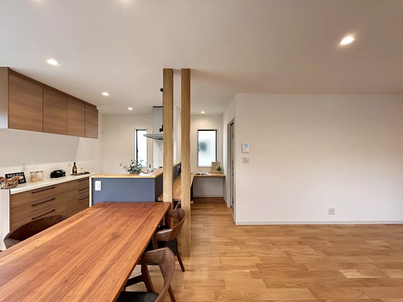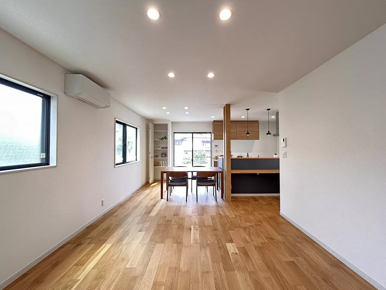 玄関からすぐにアクセスできる位置に3.0帖のファミリークロークを用意。外出時に必要な上着やバッグをまとめて収納できます。使い勝手のいいL字型リビングは広々とした空間です。