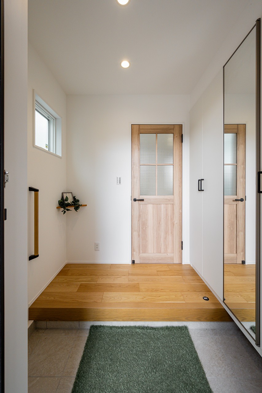 壁一面のワイドな収納スペースを備えた玄関ホール。靴のほか、お出かけ前に必要な物をたっぷりと収納できます。 玄関に出しっぱなしになりがちなお子様の外遊び道具なども、ゲストから見えないように隠せます♪