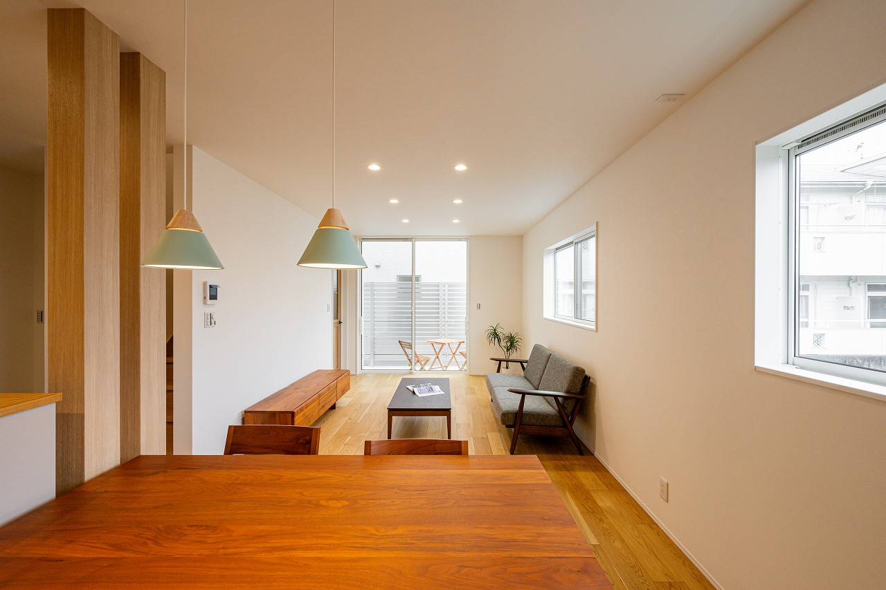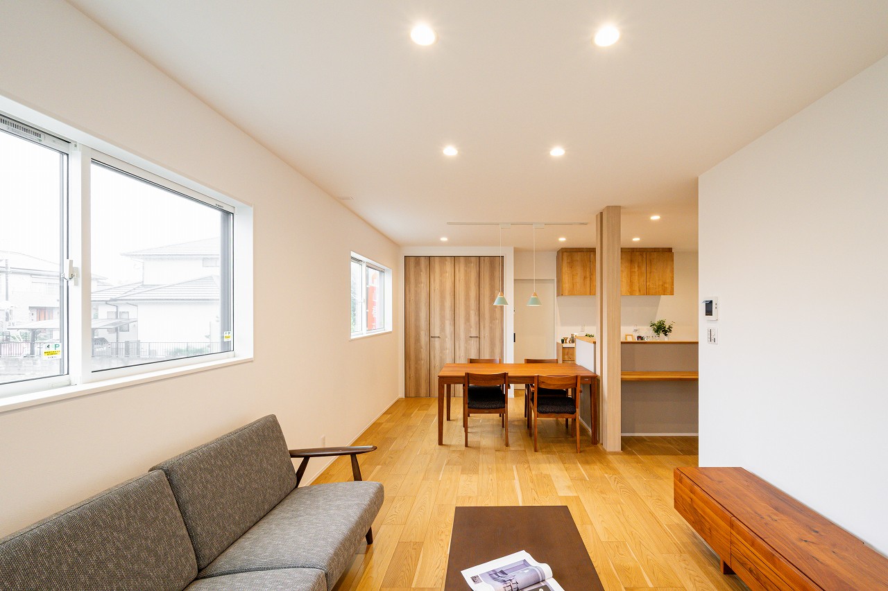 あたたかみのある木目を用いてナチュラルな雰囲気に仕上げた18.6帖のLDK。窓を3つ設けた、明るく爽やかな空間です。 スペースを効率的に使える人気のL型を採用しています。