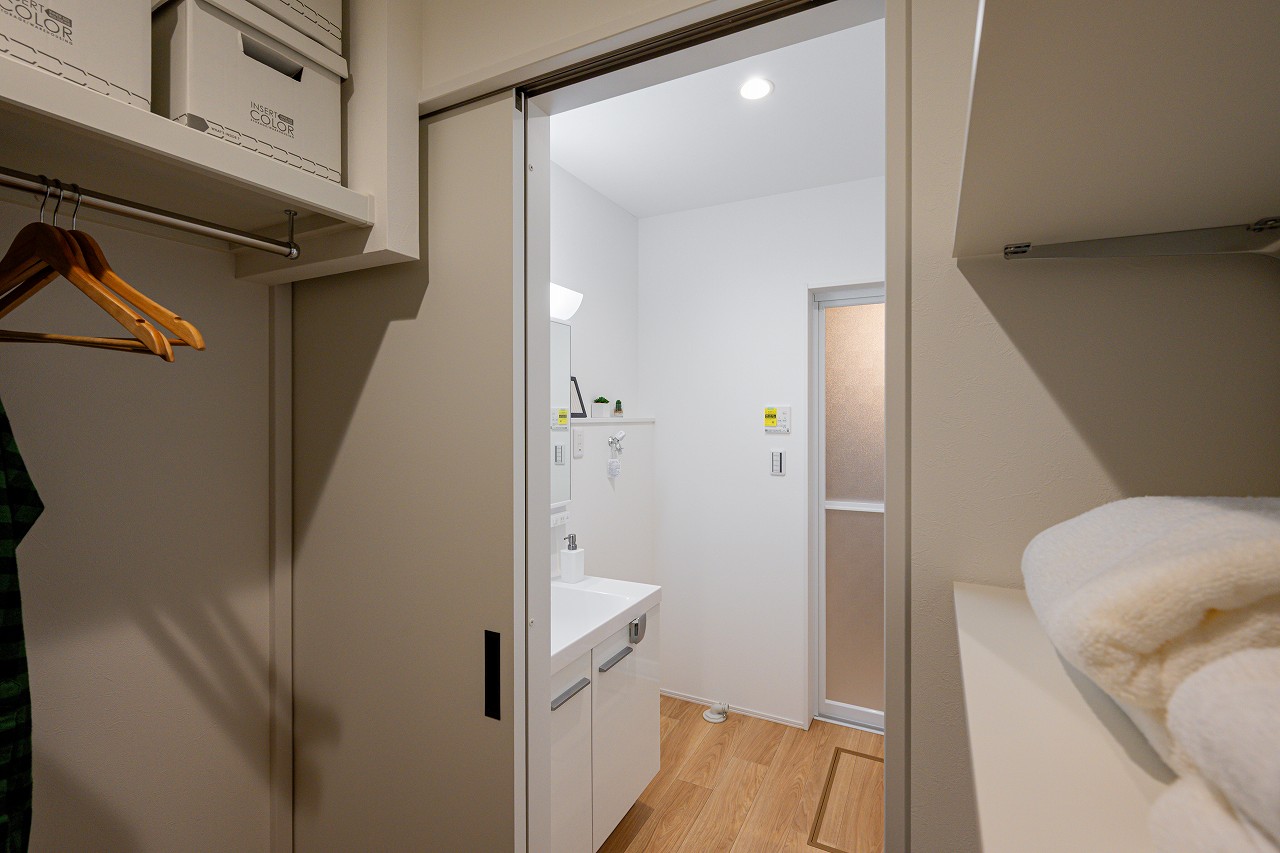 ホワイトを基調とした清潔感のある洗面室。キッチンスペースから直接出入りできるため、効率よく家事の同時進行ができます。 食事前に手洗いをする習慣にも役立ちそうですね♪