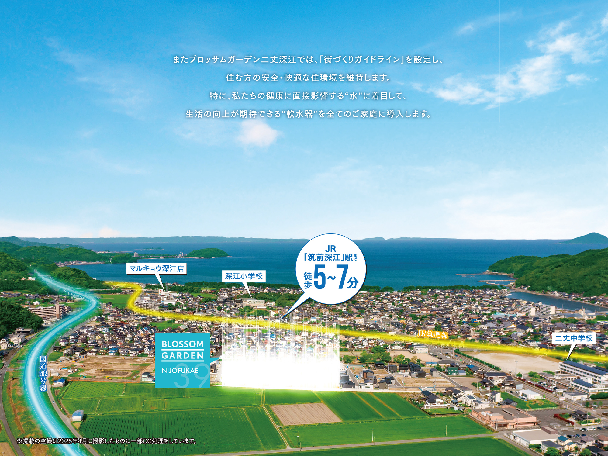 最寄りのJR筑肥線「筑前深江」駅までは徒歩5〜7分という近さ。地下鉄空港線との直通運転により、都心の「天神」駅までも乗り換えなしで約46分と、通勤・通学に非常に便利な立地です。また、お車での移動も西九州自動車道「前原IC」まで約9分とスムーズ。ONとOFFのメリハリがある、快適なフットワークを実現します。