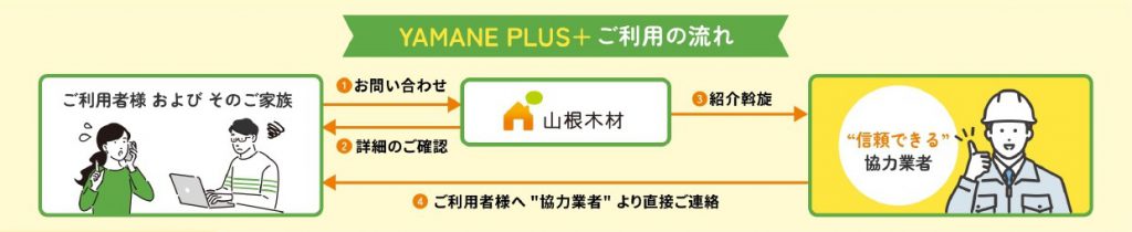 ※2.お客様と協力業者との間でのトラブルが生じたとしても、山根木材ライフパートナー(株)に責任が生じることはありませんので、ご了解ください。また、地域によってはサービスのご提供が出来ない場合があります。